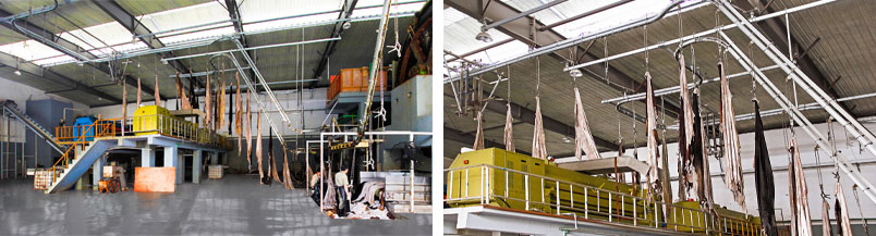 This is the high-hanging conveyor hauled by single machine applicable for various kinds of wet leather(e.g. raw hides,gray leather,wet blue skin,etc).Meanwhile,it can make single hanging leather convey to the next process for continuously processing. The biggest characteristic of this machine is that it can make full use of workshop space to convey various kinds of wet skin which has been completed in the above process one by one to the next process to continue processing.